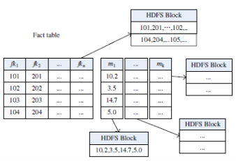 Таблицы измерений продублированы по всем узлам системы MapReduce (MR). Они хранятся по строкам. Таблица фактов делится на несколько групп: в 1-ю группу входят столбцы (колонки) внешних ключей измерений (fki), столбец каждого факта (mi) образует отдельную группу (группы 2,…,к+1). Все блоки таблиц измерений и групп таблицы фактов распределены MapReduce по узлам (автоматически) произвольным образом (MR пытается это делать равномерно).