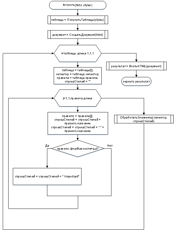 Как видно из схемы на рисунке 1, клиентское приложение по протоколу HTTP получает структуру (в подпроцессе Получить Таблицы) для дальнейшего прохода по ней и встраивания стилей соответствующим элементам. Для создания необходимого дерева объектов из HTML-кода создается элемент типа iframe внутри подпроцесса Создать Документ и возвращает документ, соответствующий данному HTML-коду. Непосредственно выбор элементов и встраивание происходят в подпроцессе Обработать Элементы, схема работы которого представлена на рисунке 2.