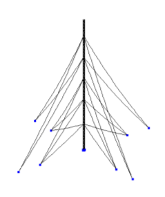 В программном комплексе ЛИРА-САПР 2013 расчет на динамическое пульсационное воздействие возможен только в линейной постановке задачи. Мачта с многоярусными оттяжками является геометрически нелинейным сооружением, так как в ней присутствуют гибкие нити — оттяжки. В связи с этим производится линеаризация расчетной схемы мачты, в которой оттяжки заменяются упругими опорами, расположенными в местах крепления оттяжек к стволу мачты [1]. Жесткость упругих опор для каждого яруса оттяжек в горизонтальном направлении вдоль и поперек направления оттяжек вычисляется нелинейным статическим расчетом. Линеаризованная расчетная схема представлена на рис. 3.