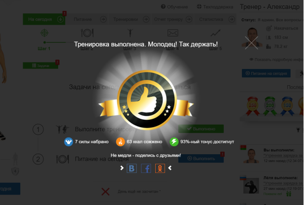 Рис. 1. Награда за тренировку — повышение Силы и Тонуса Пользователя
