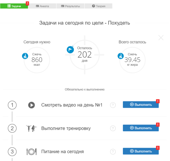 Таким образом достигается максимальный результат по достижению Цели в результате объединения задач по тренировкам, питанию и водному балансу. Помимо этого, такой подход, а именно выполнение нескольких задач последовательно и ведение Пользователя по ним, вносит ясность и простоту в сложный процесс достижения Целей на Сайте.