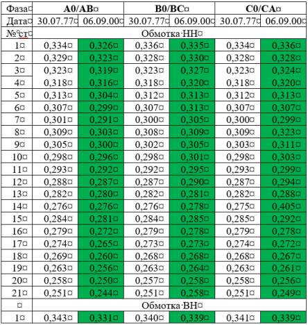 Результаты расчетов изменений сопротивлений на i-ом положении фазы по отношению кпаспортному замеру на аналогичных положении ифазе