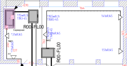 The figure 3 shows part of the layout of network equipment, as well as the output of fiber-optic cable and twisted pair, by this analogy, work was done with the rest of the rooms of the entire floor.