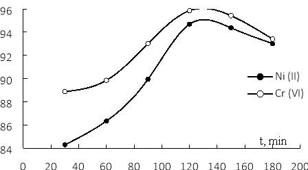 Для обоих ионов от 30 минут до 120 минут эффективность адсорбции постоянно возрастала, достигая максимума при t = 120 минут, а затем слегка снижалась. Таким образом, для адсорбционного равновесия как Ni(II), так и Cr (VI), достигнутого через 120 минут, последующее встряхивание могло привести к нарушению равновесия, в результате чего скорость десорбции была больше скорости адсорбции, следовательно, эффективность адсорбции снижается через t > 120 минут.