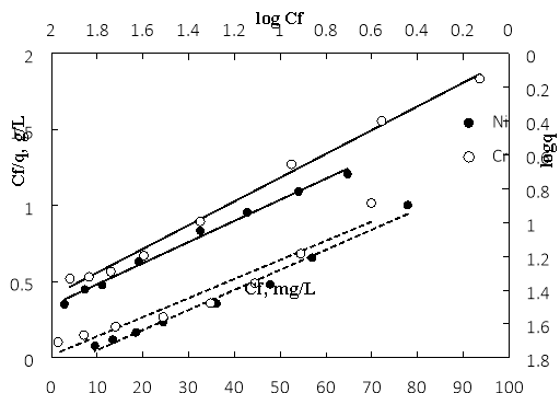 Обратите внимание, что максимальная адсорбционная нагрузка и сродство к адсорбции уменьшаются на порядок Ni(II)> Cr(VI).