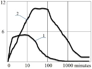 Как показано на рисунке 1, концентрация связующих в растворе всегда проходит через максимум и может рассматриваться как промежуточная стадия последовательного процесса гидратации. Следовательно, по изменению во времени концентрации исходного связующего, растворенного в жидкой фазе, можно определить, когда и какой из процессов — растворение вяжущего или высвобождение опухолей — самый медленный предел всего курса гидратации в целом.