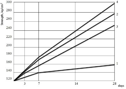 Рис. 2. Результаты испытаний прочности бетона при повторных вибрациях: 1 — бетон повторно вибрирует 1 раз, 2 — бетон вибрирует 2 раза, 3 — бетон вибрирует 3 раза, 4 — контрольные образцы, не подвергнутые замораживанию