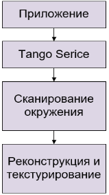 Модуль сканирования окружения является одним из самых важных в системе и, одновременно, одним из самых массивных и сложных. Его суть заключается в обработке данных, пришедших из модуля Tango Service, а именно в манипуляции данными структур TangoPointCloud, Tango3DR_Image_Buffer и Tango3DR_Pose. После успешной подписки на события получения текущего кадра и получения доступного облака точек приложение начинает их периодически получать. Обработка этих событий описана ниже.