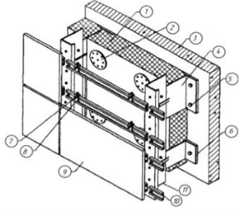 Рис. 1. Конструкция вентилируемого фасада: 1 — утеплитель, 2 — тарелочный дюбель крепления утеплителя, 3 — основание, 4 — кронштейн, 5 — анкерный болт крепления кронштейна, 6 — паронитовая прокладка, 7 — распорный винт, 8 — кронштейн для скрытого крепления облицовочных плит, 9 — облицовочная плита из керамогранита, 10 — горизонтальный профиль, 11 — вертикальный профиль.