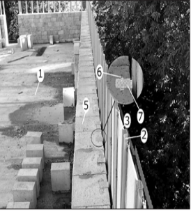 Рис. 2. Возведение наружных стен с устройством вентилируемого фасада без строительных лесов: а — строительная площадка; б — готовая наружная стена; 1 — монолитные перекрытия; 2 — металлические кронштейны; 3 — керамогранит; 4 — металлическая закладная; 5 — полистиролбетонные блоки; 6 — выравнивающие профили; 7 — кляммеры