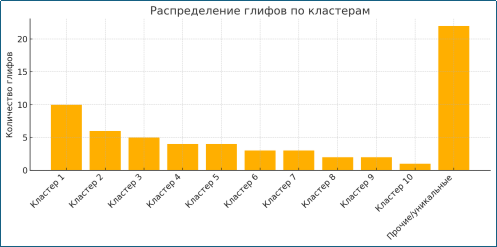 Четвёртый этап — анализ распределения. Были определены частотные кластеры. Кластер 1 оказался самым многочисленным (10 глифов), что позволяет предположить его функциональную роль в тексте (например, структурный маркер или служебный элемент).
