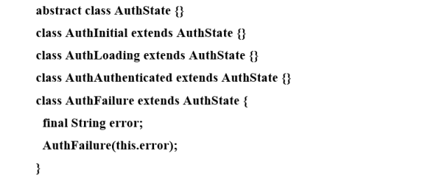 Аналогично, описываем возможные состояния процесса авторизации — например, initial (начальное), loading (выполняется вход), authenticated (пользователь успешно вошел), authenticationFailure (ошибка входа). Они реализуются как наследники абстрактного класса AuthState