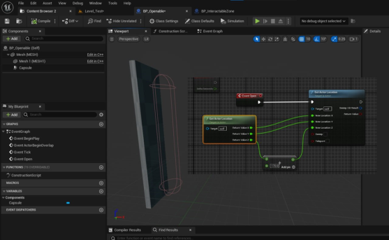 В качестве примера удобства использования BlueprintNativeEvent, можно рассмотреть AOpenable::Open(): В Blueprint реализации это событие используется для запуска анимации открытия двери/воспроизведения звука/деактивации коллайдера. Без изменения C++ кода базового класса реализуется совершенно разное визуальное и звуковое поведение.