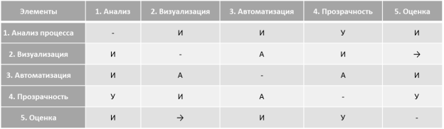 – Прозрачность — центральный элемент: она получает данные от Визуализации и Автоматизации, а сама оказывает управляющее воздействие на процесс, делая его более организованным.