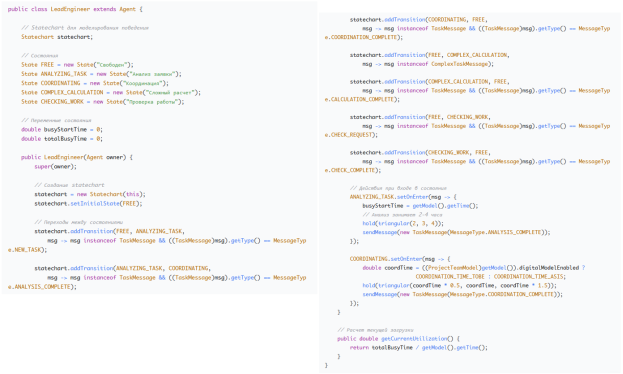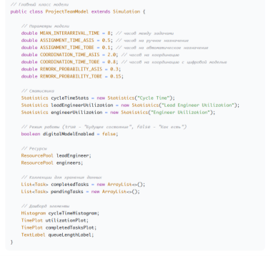 – Описание: агент-ориентированная природа модели позволила отслеживать производительность каждого инженера. Анализ показал, что время выполнения однотипных задач разными инженерами может отличаться на 40–50 %. При этом, когда наиболее опытный инженер завершал свою задачу, он часто переходил в состояние Свободен, в то время как его коллеги испытывали трудности. Неформальная практика взаимопомощи существовала, но не была встроена в процесс и не фиксировалась моделью «Как есть».