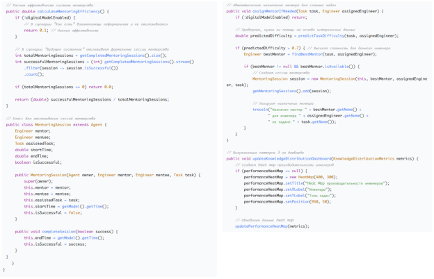 – Для устранения Паттерна 3 в цифровую модель была заложена функция автоматического назначения «ментора» для сложных задач. Если модель (на основе исторических данных) предсказывает, что задача будет амбициозной для конкретного инженера, она автоматически назначает ему в помощь наиболее компетентного в данной области коллегу. Это превращает неформальную помощь в управляемый процесс, ускоряя обучение и выравнивая компетенции в группе.
