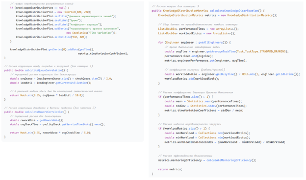 – Оптимизация «узких мест»: модель, как показало имитационное моделирование, четко идентифицирует «узкое место» в лице ведущего инженера. Это позволяет перераспределить часть рутинных проверок на старших инженеров или внедрить систему парного программирования (peer review) для снижения нагрузки на ВИ.