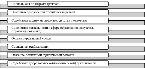 Деятельность благотворительных организаций осуществляется в рамках законодательства Российской Федерации, которое определяет законность создания этих организаций, основные положения их деятельности, цели, формы в которых они могут создаваться и процесс их функционирования. Общий перечень целей функционирования благотворительных организаций представлен на рисунке 1.