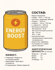 Энергетические напитки представляют собой комбинацию биологически активных веществ, направленных на стимуляцию центральной нервной системы и повышение энергетического обмена: кофеин, таурин, глюкуронолактон, витамины группы B, сахар или подсластители.