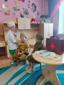 Деятельностный и творческий блок проекта включал в себя сюжетно-ролевые игры: дети активно примеряли на себя роли санитаров, врачей, пациентов, солдат и командиров. В ходе этих игр они учились оказывать первую помощь, заботиться о здоровье, принимать решения и работать в команде, а также осознавали неоценимый вклад медицинских работников в годы войны. Данный подход способствовал развитию эмпатии, коммуникативных навыков и социальной адаптации.