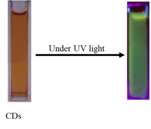 Passion fruit juice after hydrothermal treatment gives a clear dark brown solution. When the solution is irradiated with ultraviolet rays, CDs emit green light (Figure 3).