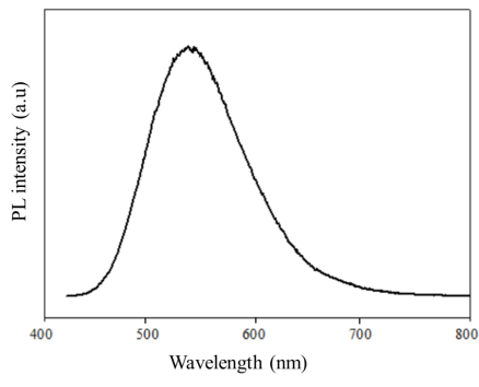 The fluorescence spectrum of CDs has a broad emission band extending from violet to yellow (Figure 4). The maximum emission wavelength is in the range of 530–540 nm. In addition, the emission spectrum is asymmetric with a small tail extending into the longer wavelength region. These phenomena suggest that the fluorescence properties of CDs are related to diverse surface states [15].