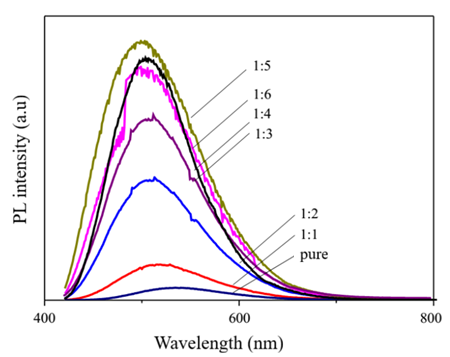 The fluorescence properties of CDs have also been studied in alcohol. Figure 5 shows the emission spectrum of CDs when diluted with alcohol at varying volume ratios from 1:1 to 1:6. It was observed that the emission intensity of CDs in alcohol increased significantly compared to pure CDs. As the volume ratio of CDs to alcohol decreased from 1:1; 1:2; 1:3; 1:4; 1:5 (CDs concentration in water decreased), the emission intensity gradually increased. The greater the amount of alcohol added, the lower the probability of collisions between CDs dots. Therefore, the energy loss of CDs due to collisions decreased. In addition, diluting CDs also reduced self-absorption in high-concentration solutions. As a result, the lower the concentration of CDs in the solution, the higher the emission intensity. However, when the concentration of CDs is too low (ratio of 1:6 or higher), the number of emission centers in the solution is reduced, and therefore the emission intensity decreases. This result was also observed in CDs fabricated from onion peels [16].