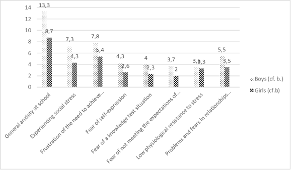 Fig. 2. Indicators of the severity of anxiety factors in boys and girls (according to the Romitsyn method) (cf. b.)