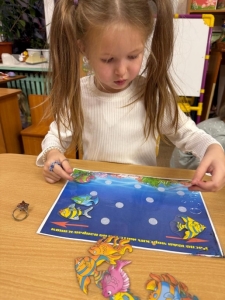 «Посчитай, сколько рыб» ребенок проговаривает в каком направлении плывут рыбы — направо (налево), каких рыб больше, сколько больших рыб плывут направо, что нужно сделать, чтобы рыб стало поровну, находит цифру, которая обозначает количество рыб.)
