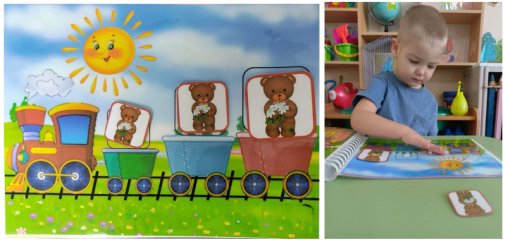 «Рассади зверей в вагоны»: маленький, средний, большой. Задача ребенка расставить медведей в правильные вагоны и проговорить все действия вслух: «Маленький медведь поедет в первом вагоне, средний — во втором, маленький — в третьем».