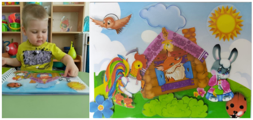 «Поставь правильно» . В центре поставь избушку, слева от избушки — петушка, справка от избушки — зайца, над избушкой — птицу, под избушкой — куст, в левом верхнем углу — солнышко, в правом верхнем углу — облако, в левом нижнем углу — божью коровку, в правом нижнем углу — цветок.