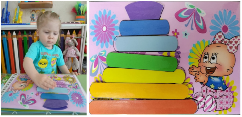 « Собери пирамидку » и назови цвета радуги: самая длинная красная полоска, оранжевая полоска короче красной полоски и т. д.