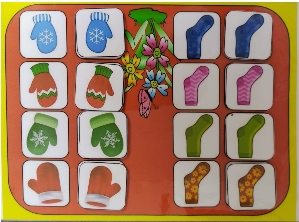 «Найди пару» (пара одинаковых предметов). В данной игре дети учатся раскладывать предметы одежды (рукавички и носки) парами, группируя их по цвету