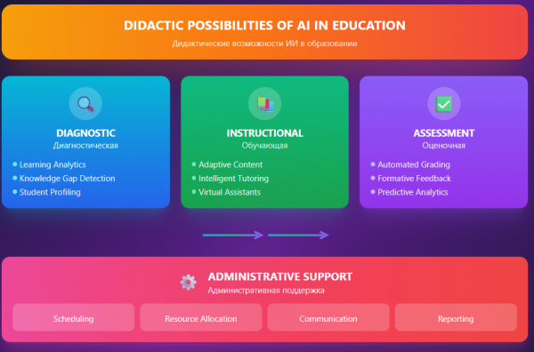 In conclusion, the didactic possibilities of artificial intelligence in education present transformative opportunities alongside significant responsibilities. This analysis demonstrates that AI-powered tools offer substantial potential for personalizing instruction, automating assessment, enhancing student engagement, and improving administrative efficiency. Kazakhstan's comprehensive legislative and policy framework, including the 2025 Law on Artificial Intelligence and national standards for AI in education, establishes a foundation for responsible innovation aligned with international best practices.