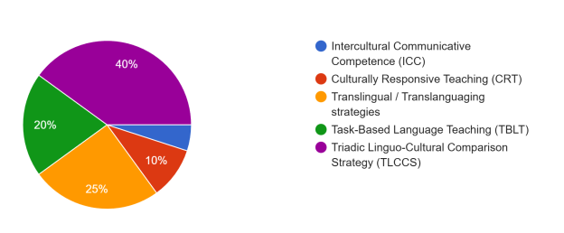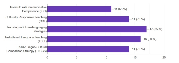The results further show that teachers employ a diverse range of intercultural strategies in their instructional practices. Intercultural Communicative Competence (ICC), Culturally Responsive Teaching (CRT), and Task-Based Language Teaching (TBLT) were identified as the most frequently used approaches. These strategies were valued for their ability to contextualize professional vocabulary within authentic communicative and cultural frameworks, thereby promoting meaningful learning.