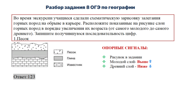 Применение на уроках географии опорных сигналов способствует облегчению усвоения материала, улучшает запоминание информации и вызывает интерес у учащихся. Опорный сигнал — набор ассоциативных ключевых слов, знаков и других опор для мысли, расположенных особым образом, заменяющий некое смысловое значение. Он способен мгновенно восстанавливать в памяти известную ранее и понятную информацию [4].