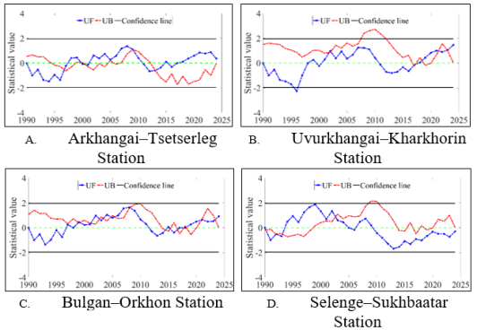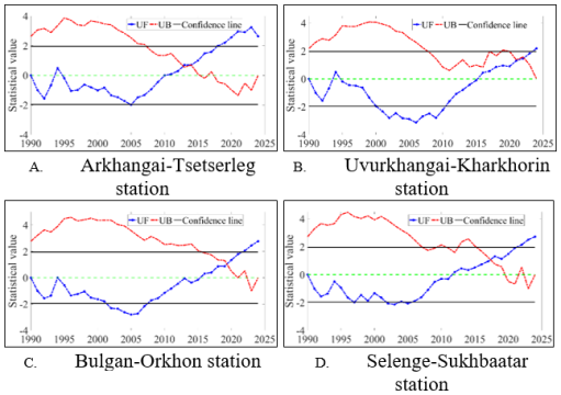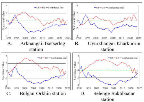 Changes in precipitation and air temperature in the Orkhon River watershed were analyzed over a 35-year period using the Mann–Kendall (MK) test. The results show that Z-values at most stations are positive, indicating an increasing trend in air temperature. In particular, Kharkhorin station in Uvurkhangai province (Z = 2.04) and Orkhon station in Bulgan province (Z = 1.37) exhibit statistically significant temperature increases (Figure 2).