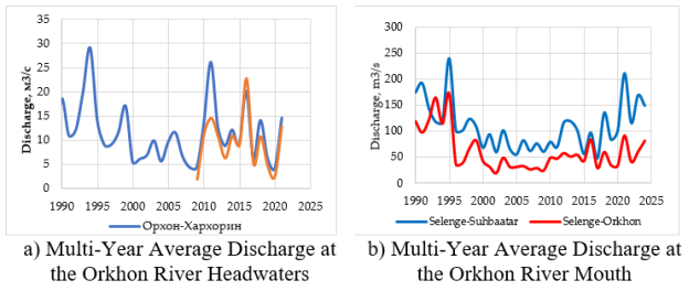 River water resources of the Orkhon River increase along its course. The multi-year average discharge is 13.3 m³/s at Kharkhorin in Uvurkhangai, approximately three times higher at Orkhon in Bulgan, and nearly nine times higher at Sükhbaatar in Selenge. This increase reflects the expansion of the catchment area and contributions from major tributaries.