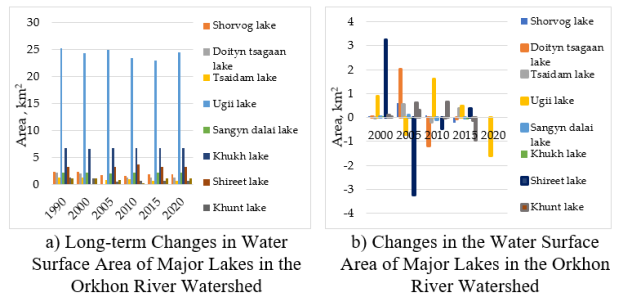 Fig. 9. Water Surface Area and Changes of Major Lakes in the Orkhon River Watershed