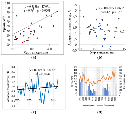 Fig. 10. Orkhon River Watershed: (a) air temperature and watershed mean precipitation, (b) watershed mean precipitation and river discharge, (c) air temperature, (d) correlation between discharge and precipitation