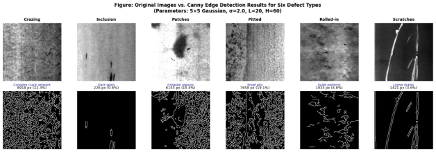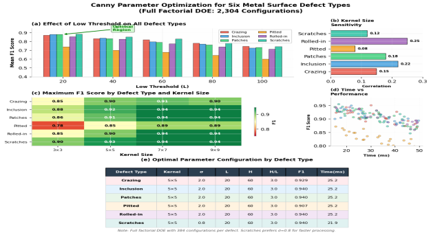 Industrial surface defect inspection faces three core challenges: defect scale diversity, surface texture interference, and real-time requirements. As a critical step for defect geometric feature extraction, Canny edge detection performance is highly sensitive to parameter configurations including Gaussian filter size and dual thresholds. This study systematically optimizes Canny parameters for six typical metal surface defects (crazing, inclusion, patches, pitted surface, rolled-in scale, scratches) using full factorial experimental design (4×5×6 parameter combinations, 6912 independent runs). Results show that the low threshold (L) is the most sensitive parameter (|r|=0.83), with optimal general configuration of kernel size 7×7, σ=1.4, L=20, H=60–80 (H/L≈3). Under this configuration, five defect types achieve F1≥0.929, while pitted surface reaches F1=0.907; real-time mode (3×3 kernel) completes detection within 20ms with <7 % performance loss. This study provides parameter tuning guidelines for industrial vision systems.