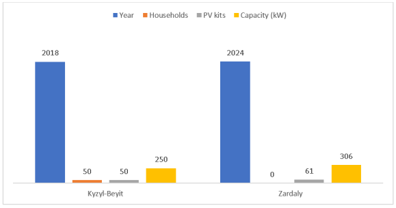 Particular attention should be paid to pilot electrification projects in the most remote villages. For example, in the Aksy District, in the village of Kyzyl-Beyit, a group of experts implemented about 50 autonomous solar kits in 2018, including batteries, inverters, televisions, and refrigerators, for 50 households, which made it possible to provide lighting and basic household services in the absence of a centralized grid [7].