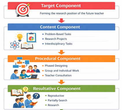 In the study by A. O. Yesimbekova, B. K. Kystaubayeva, and A. S. Taurbekova [5], the development of research competencies in future primary school teachers is examined and justifiably identified as one of the priority areas of contemporary pedagogical science. It is important to note that, in the context of the modernization of the education system, the implementation of a research-based approach in teacher training acquires particular significance, as it ensures the development of critical thinking and contributes to the formation of professional flexibility in future teachers within a dynamically changing educational environment.