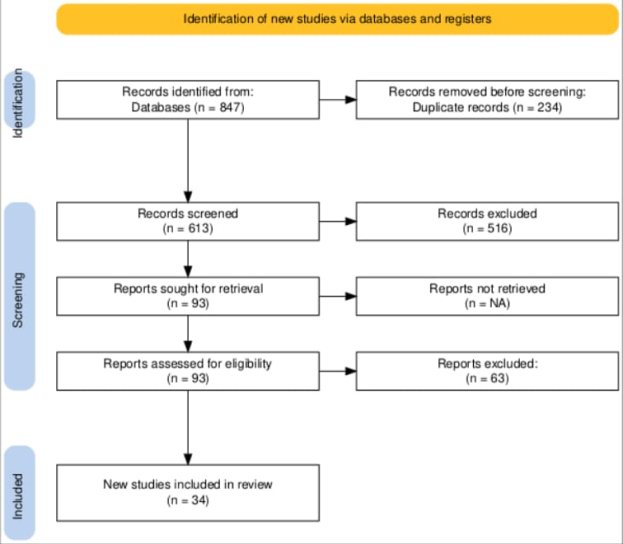 The primary result of the database search was 847 potentially relevant record. 613 articles underwent title and abstract screening after removing the duplicates (n=234). Full-text review of 97 articles yielded and resulted in 34 studies meeting the mentioned inclusion criteria. Their characteristics are summarized in Table 1
