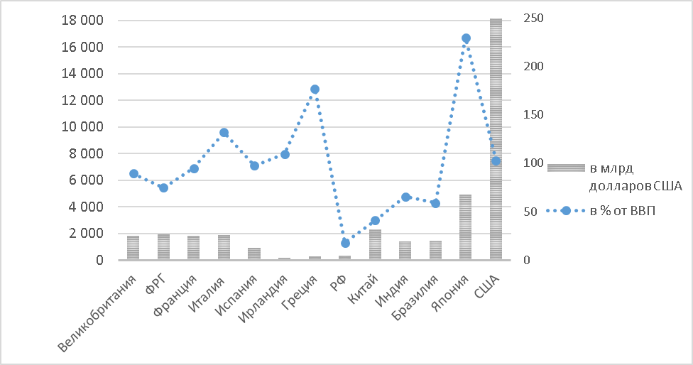 Рис. 1. Государственный долг ряда стран в млрд долларов США (левая ось) и в % от ВВП (правая ось), 2015 г. Источник данных: составлено автором на основании данных Европейской Статистической Комиссии и Международного Валютного Фонда
