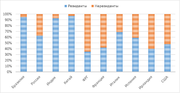 Рис. 2. Держатели госдолга ряда стран, в %, 2015г. Источник данных: составлено автором на основании данных Европейской Статистической Комиссии и Международного Валютного Фонда