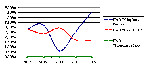 По данной диаграмме можно наглядно увидеть, что относительно стабильную доходность имеет ПАО «Банк ВТБ», поскольку она у него держалась на одном уровне, только в последние пару лет незначительно снизилась и составила 1,67 %. Но все же ПАО «Сбербанк России» занимает лидирующие позиции по выплате дивидендов и по высокой дивидендной доходности 4,57 %. Акции Сбербанка являются самыми ликвидными инструментами на российском фондовом рынке. Как правило, большой дивиденд по акции свидетельствует о «зрелости» и прочных позициях на рынке. Инвесторы, которые хотят получать периодический доход от своих вложений не только за счет роста курсовой стоимости активов могут обеспечить его, покупая акции компаний с относительно высокой и стабильной дивидендной доходностью.