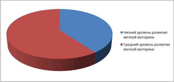 После проведения заданий выяснилось, что у 4 детей был выявлен низкий уровень развития мелкой моторики рук, что составляет 40 %. У 6 детей был выявлен средний уровень развития мелкой моторики рук, что составляет 60 %. (% вычислялись от общего количества детей исследуемой группы)