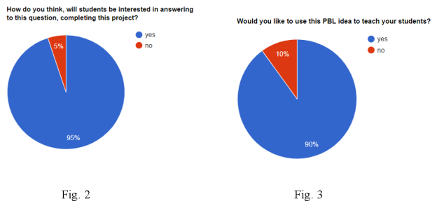 These pie charts show the responses of the future chemistry teachers. It is clear that most of the respondents (95 %) think that this project will engage students in studying and as the future teachers most of them (90 %) would like to use it in teaching chemistry. Moreover, all of the respondents believe that this PBL will be effective in teaching atomic structure and properties of Carbon to students.