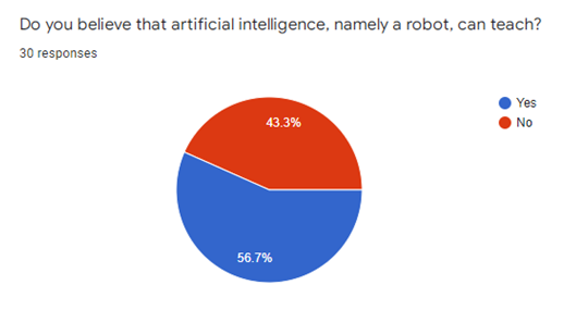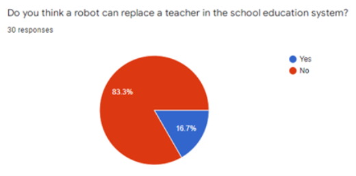 A small study was conducted on how students think about replacing teachers with robots. The questionnaire showed that less than half of the people surveyed, namely 13, believe that robots can teach, while the rest do not(figure1). A significant percentage of respondents (83.3 %) do not think that robots can replace teachers in the education system(figure 2). This study shows that students do not believe and are not ready to replace the teacher with artificial intelligence.